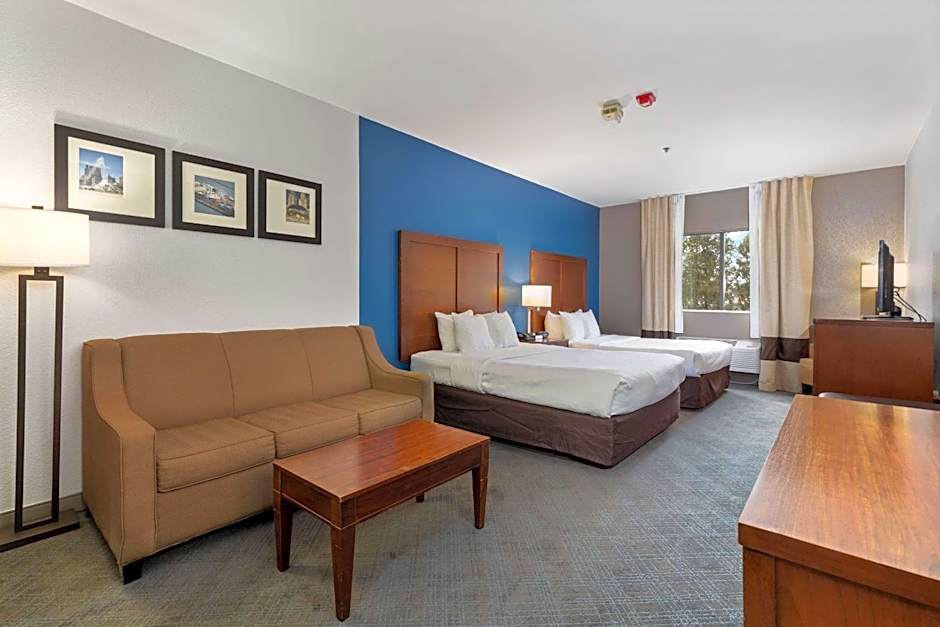This spacious suite features a microwave, refrigerator, coffee maker, iron and ironing board, flat screen-high definition cable television with HBO, and free WiFi. Also included is a work desk with ergonomic chair, coffee table, and sofa-sleeper pullout!